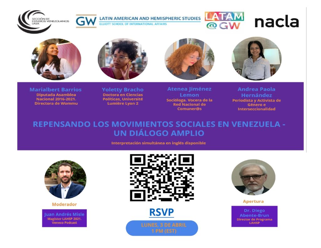 Este evento virtual se llevó a cabo el 3 de abril de 2023 patrocinado por el programa de estudios latinoamericanos y hemisféricos (LAHSP, por sus siglas en inglés) de the George Washington University, con el apoyo de la Sección de Estudios Venezolanos de LASA, LATAM@GW, y NACLA Report on the Americas. Este diálogo reúne a activistas, académicos y organizadores de base a lo largo del espectro político para crear una visión sobre el futuro de los movimientos sociales en Venezuela y poder debatir distintas perspectivas sobre teorías del cambio. Contó con la participación de: